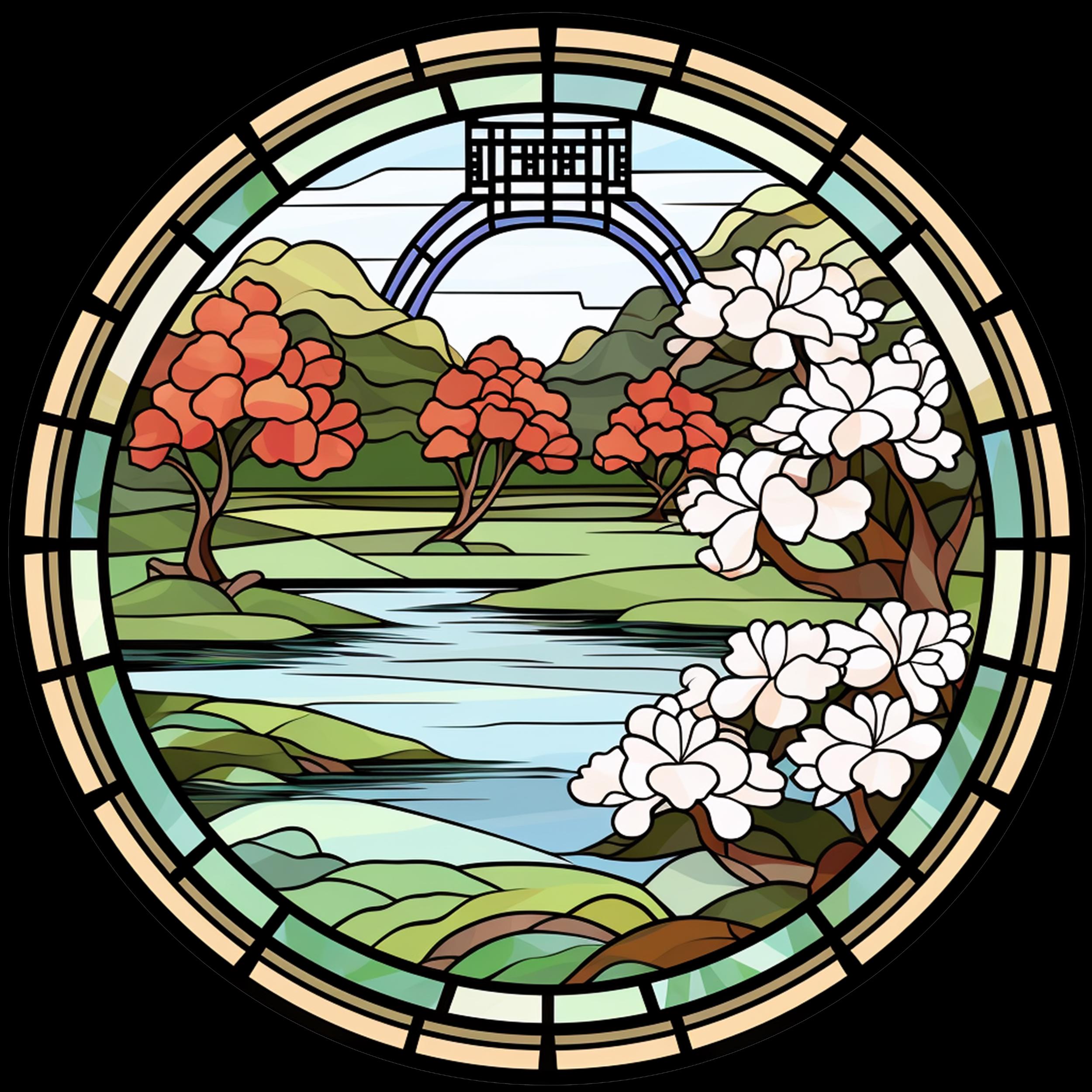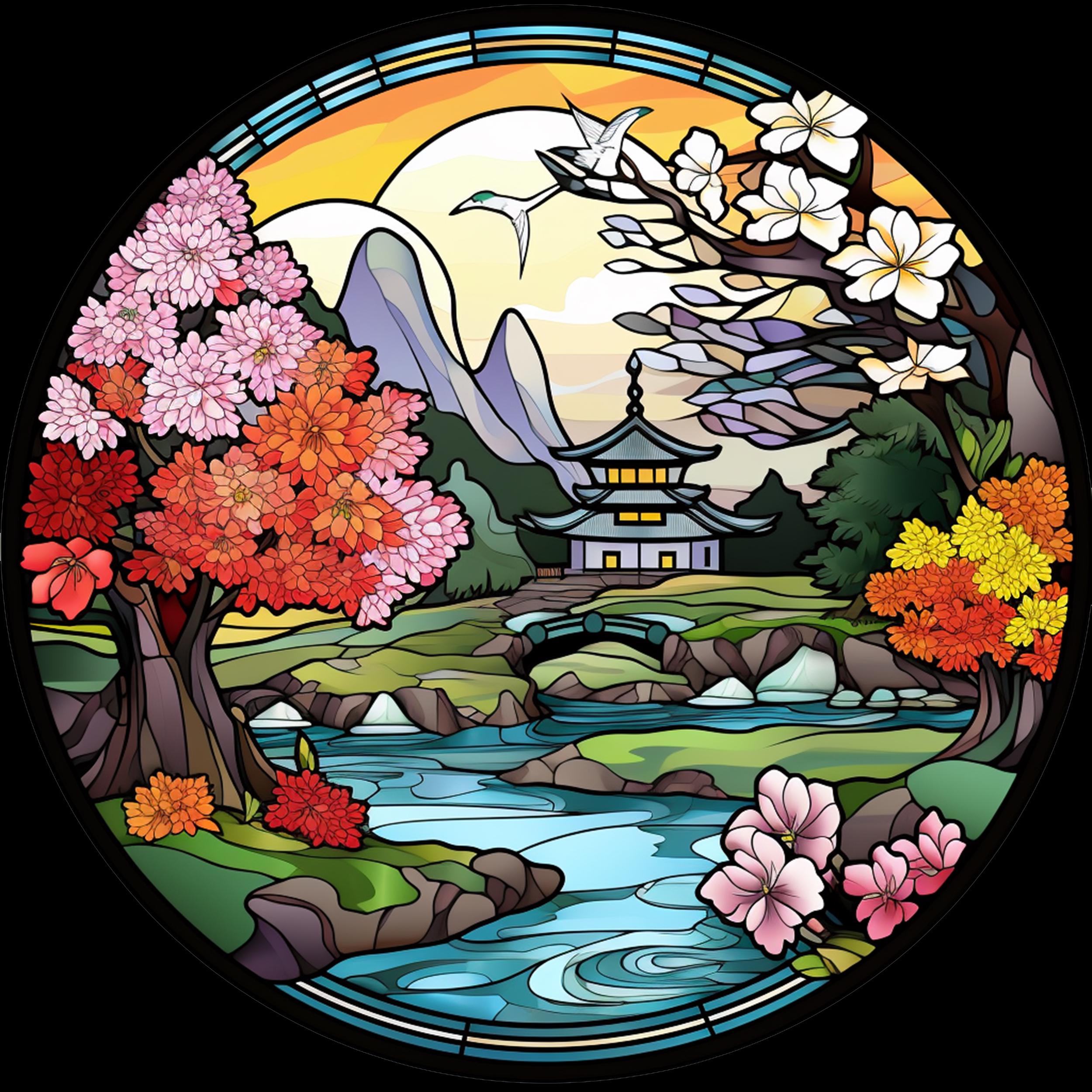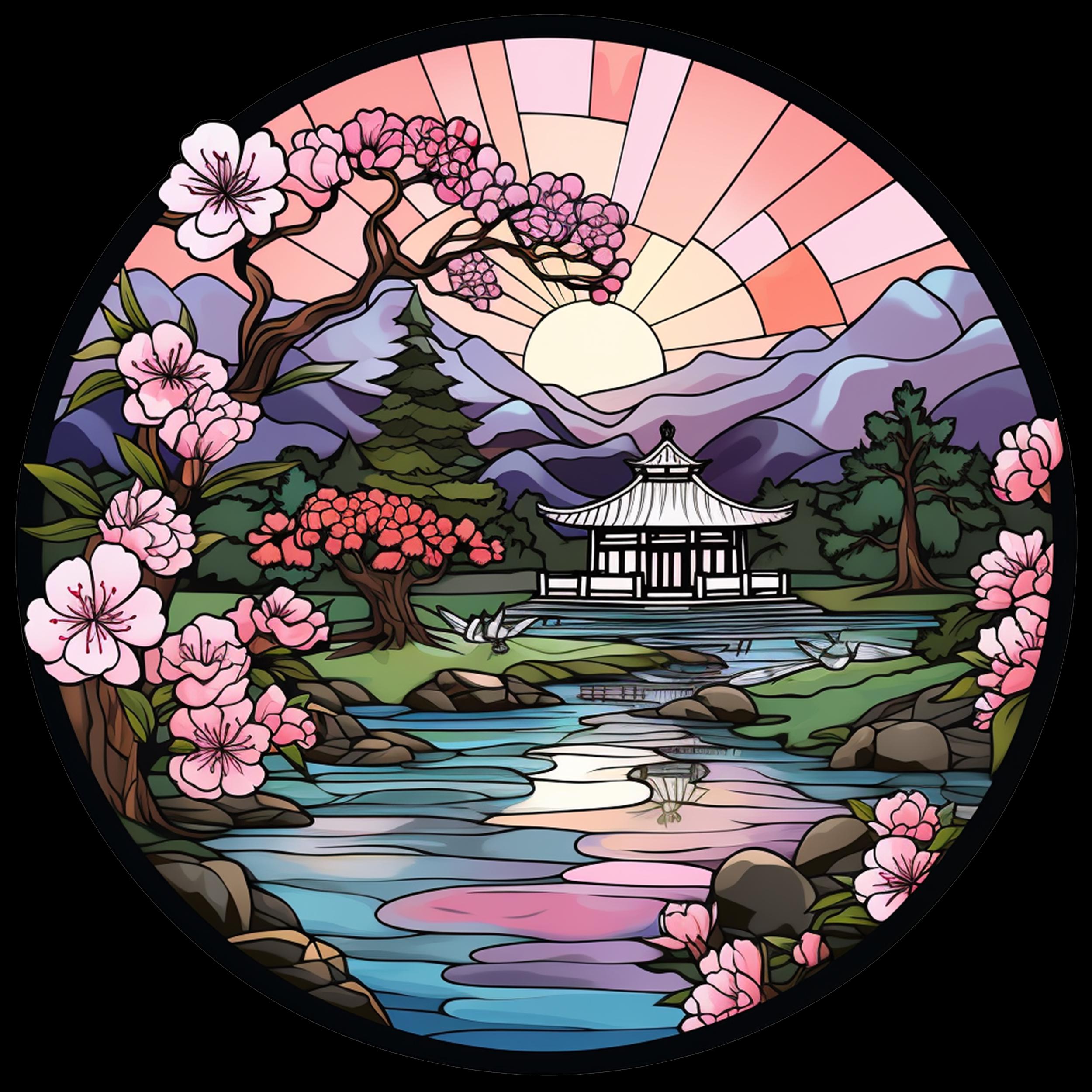 Japanese Cherry Blossom Landscape Acrylic Faux Stained-Glass Suncatcher